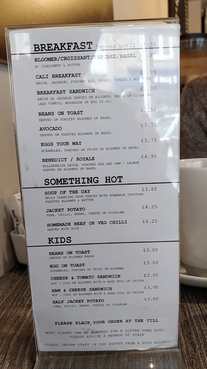 The menu at Coffee Cali offers a straightforward and inviting selection, perfect for relaxed mornings or a quiet catch-up during the day. It features a range of comforting drinks—from classic cappuccinos and flat whites to rich black coffees and smooth lattes—each crafted to complement the laid-back atmosphere of this Hebden Bridge favorite.