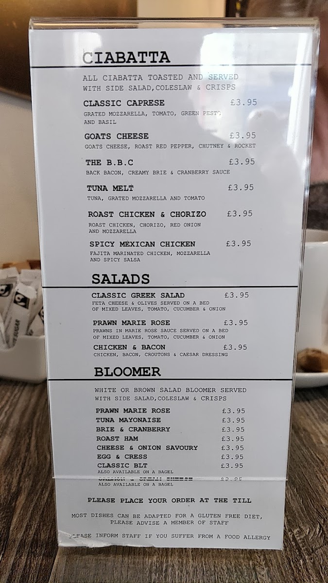 Alongside the coffee, you’ll find simple yet satisfying bites like sausages sandwiches and toasted bloomer sandwiches, as well as fresh salads and savory options like quiche or beans on toast. Whether stopping by for breakfast, a light lunch, or an afternoon treat, the menu reflects a balance of familiar flavors and homely comfort that fits naturally with the warm and welcoming setting.